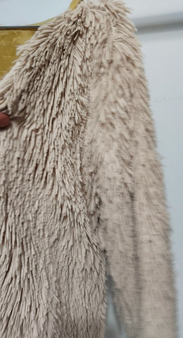 Bej renkte, tüylü detaylı suni kürk mont. Notlu yaka ve uzun kollu, bol kesim bohem tarzda midi boyda günlük kullanım için uygundur.