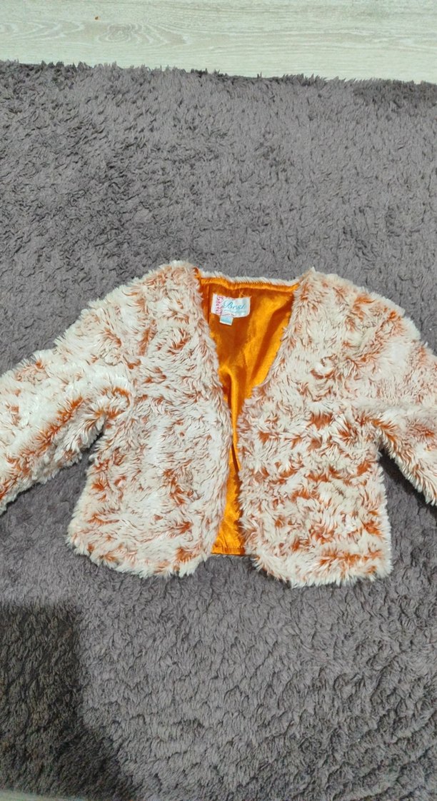 Bej renkli, bağlama desenli, uzun kollu ve yakası kesik detaylı tüylü çocuk bolero. Yumuşak ve sıcak fleece kumaştan yapılmıştır, günlük kullanım için uygundur.