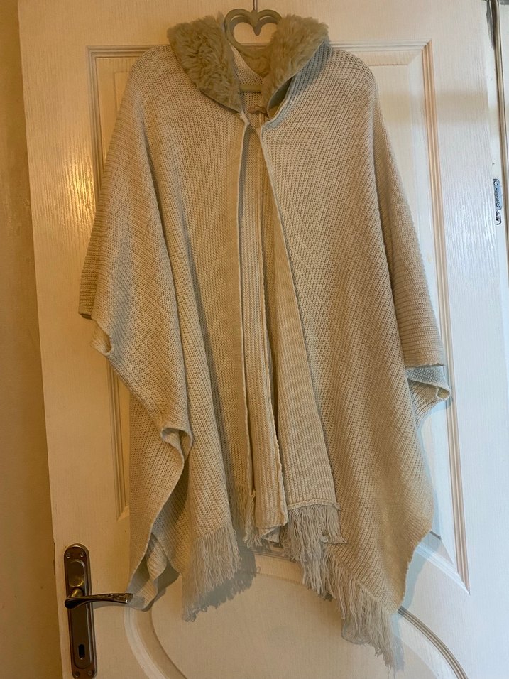 Bej tüylü Yakalı Örgü Kadın Panço