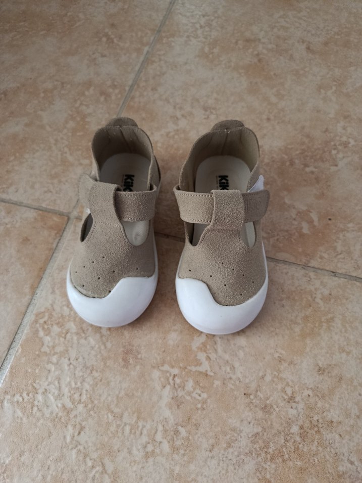 Bej süet malzemeden yapılmış, cırt cırtlı ve desensiz unisex bebek ilk adım ayakkabısıdır.