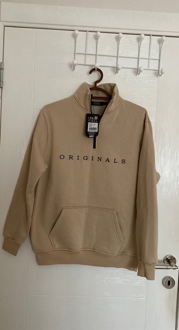 Bej renkli, uzun kollu, yuvarlak yaka ve rahat kesime sahip kadın sweatshirt. Ön kısmında cep ve "ORIGINALS" yazısı bulunur. Yumuşak ve sıcak kumaştan üretilmiştir.