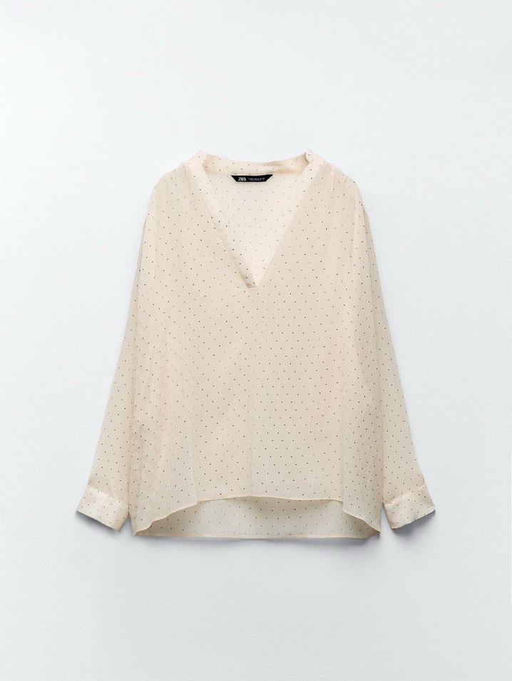 V yakalı, uzun kollu, düğmeli bej keten gömlek. Gevşek kesim ve hafif puantiyeli deseniyle rahat bir günlük tercih.