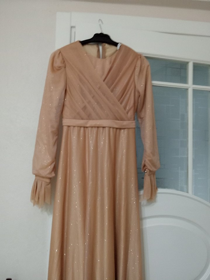 Bej uzun abiye elbise, V yaka ve drapeli detaylarla. Uzun kollu, salaş kesimli ve parlak, desensiz kumaştan yapılmıştır. Düğünler için uygun klasik şıklık. ✨