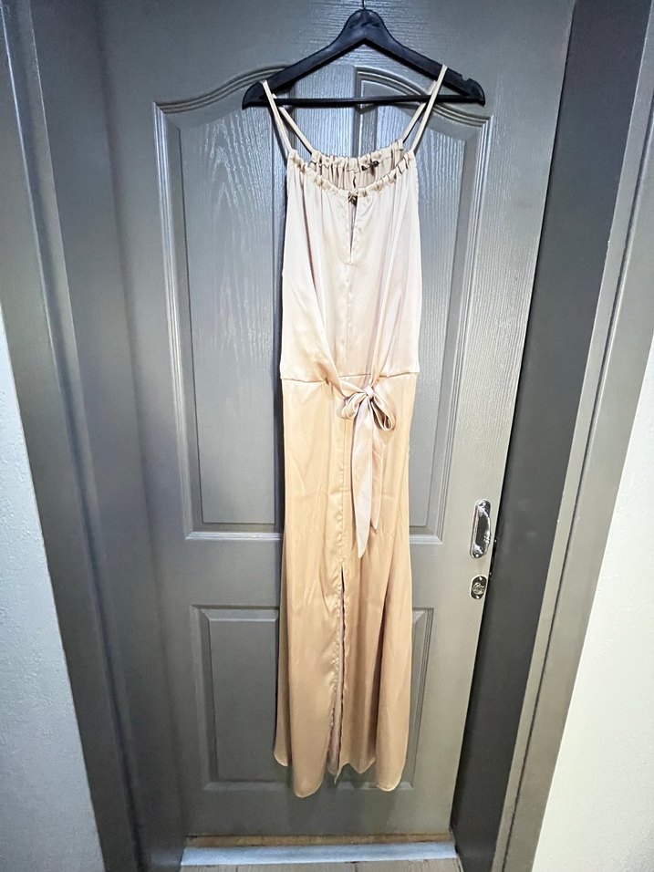 Bej uzun elbise, askılı ve halter yaka detaylı, ipeksi kumaştan. Rahat kesim ve drapeli tasarımıyla romantik akşamlar için ideal.