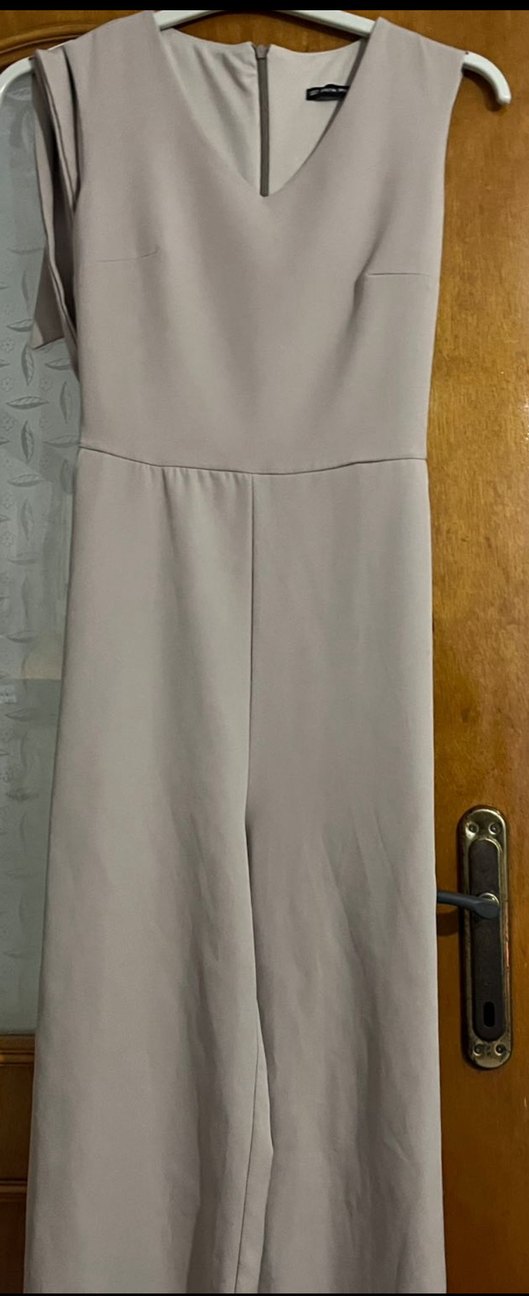 Bej renkli, askısız kadın tulumu, straplez yaka ve drapeli tasarıma sahiptir. Rahat kesim ve uzun boyludur, yumuşak sentetik kumaştan üretilmiştir, ofis için uygundur.