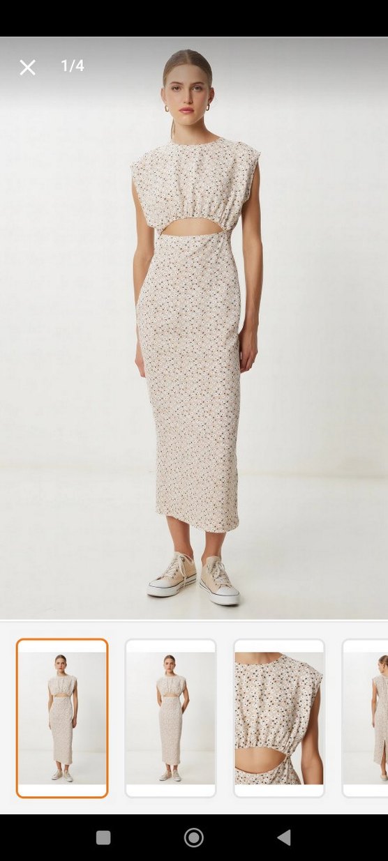 Bej renkli uzun midi elbise, bol kesim ve bağlamalı detaylarla, yumuşak keten dokusunda rahat ve şık bir görünüm sunar.
