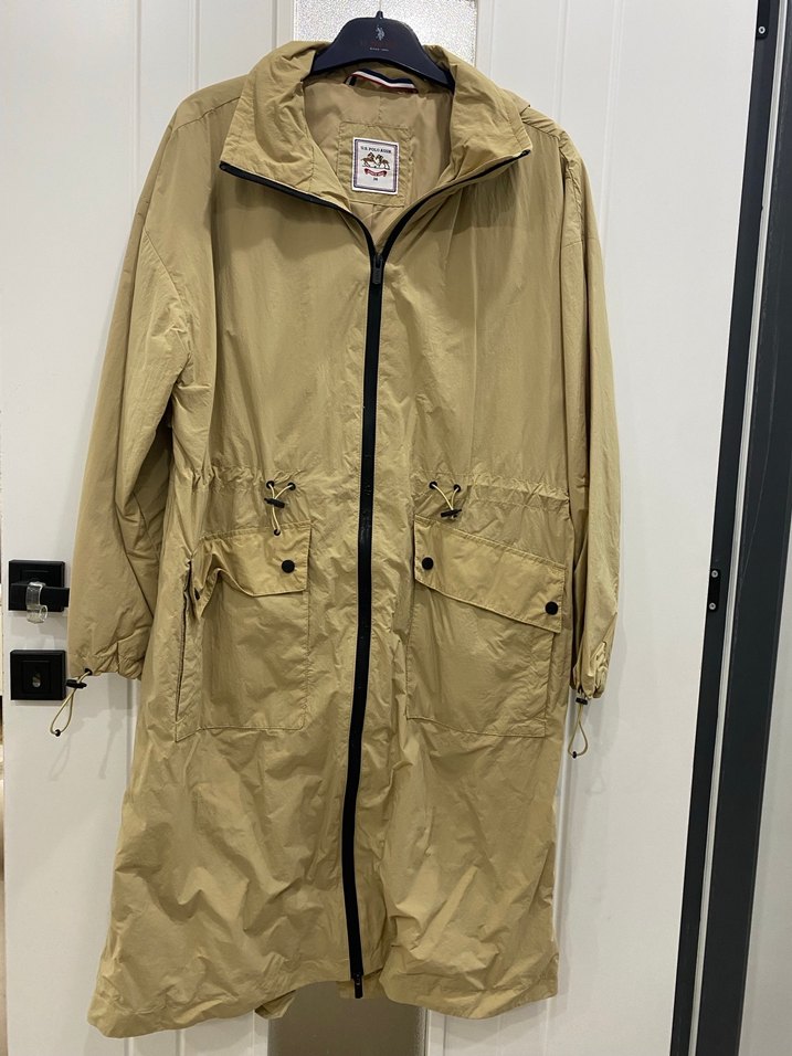 Bej renkli, fermuarlı uzun erkek yağmurluk. Sentetik kumaştan, bol kesim ve uzun kolludur. Rahat sokak stili için uygundur. ☔