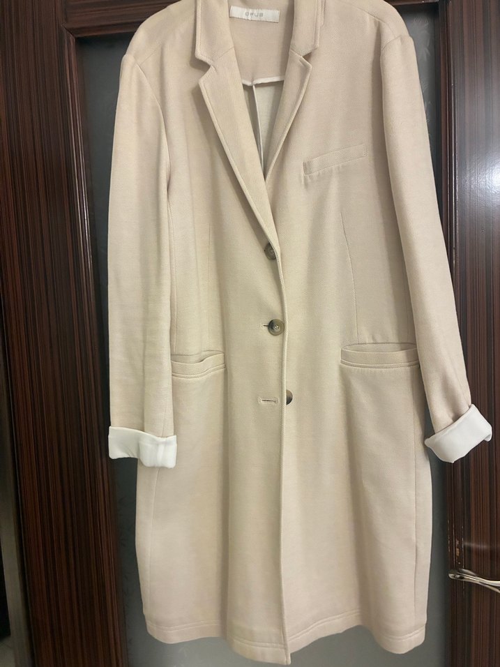 Bej renkli, uzun kollu, düğmeli, penye kumaştan yapılmış, regular fit uzun kadın ceket. Ofis için klasik ve şık tarzda uygun.