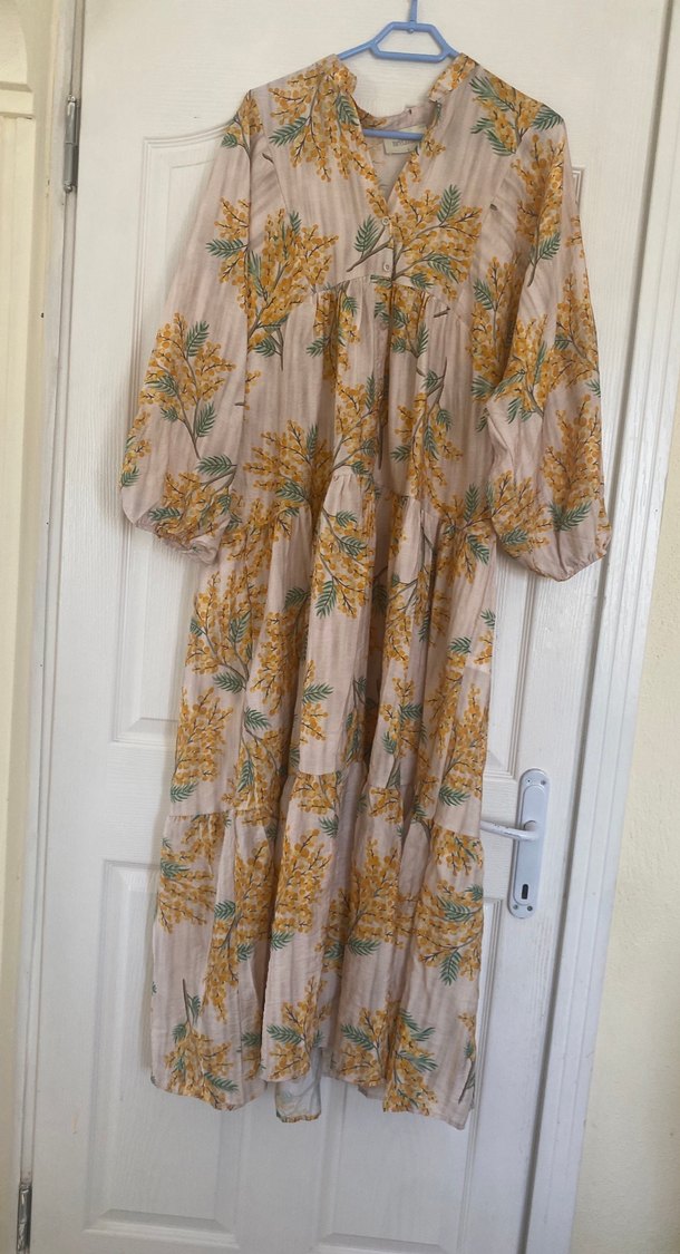 Bej renkte, uzun kollu ve V yakalı, bol kesim bohem elbise. Yumuşak sentetik kumaştan, drapeli ve pastel tonlu batik desenlidir.