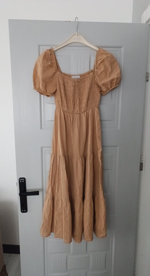 Bej uzun elbise, bol kesim, kabarık kollar ve fırfır detaylarıyla yumuşak keten kumaştan üretilmiştir. Bohem tarzıyla rahat bir günlük görünüm sunar.