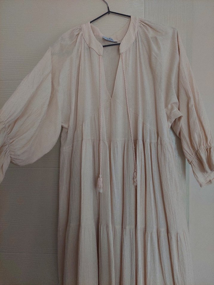 Yumuşak keten kumaştan, bohem tarzda, uzun kollu ve tek renk bej uzun elbise, pile detaylı ve bol kesim.