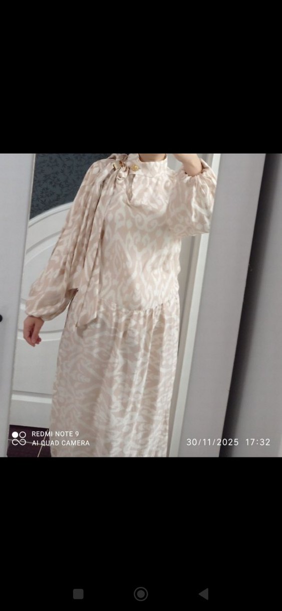 Bej renkli, uzun, salaş kesim, drapeli, uzun kollu ve yüksek yakalı elbise. İpeksi kumaştan, pastel tie-dye desenli, bohem tarzında. Düğünlerde davetlerde giyilir