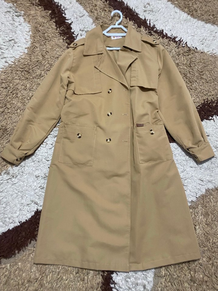 Bej renkli, uzun boy, düğmeli ön ve kesik yakalı kadın trençkot. Astarsızdır. Küçük bir kalem izi var son fotoğraftaki gibidir. 48 yazıyor ama l/xl uygun