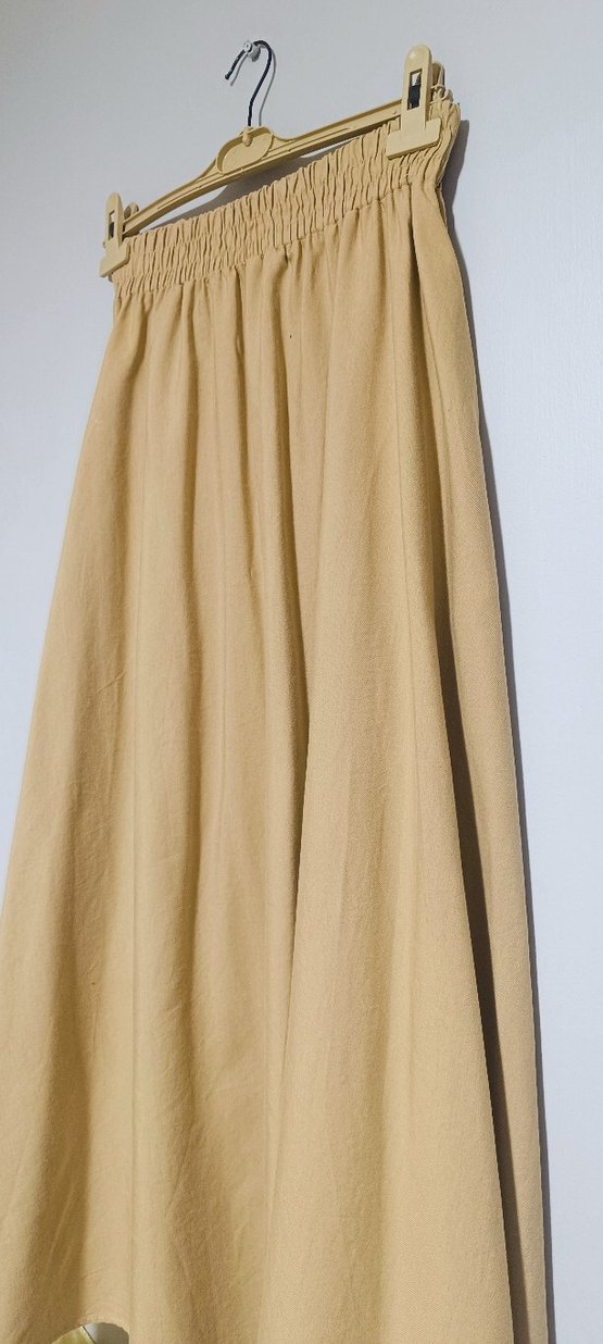 Bej renkte, kalin keten kumaştan uzun ve çan kesim, cepli beli lastikli tek ebat rahat bir etek.