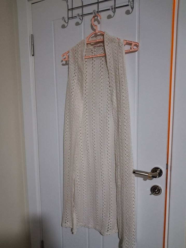 krem renkli, uzun ve örgü kadın süveter, kolsuz ve oturan kesimlidir. Notlu yaka detayıyla bohem ve minimalist tarzda, gündelik kullanıma uygundur. dar geldiği için satıyorum