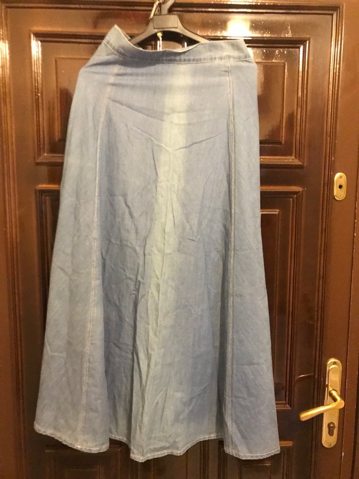 Bej renkli uzun denim kadın eteği, bol kesim ve drapeli tarzıyla bohem bir görünüm sunar. Pastel tonuyla günlük kullanıma uygundur.