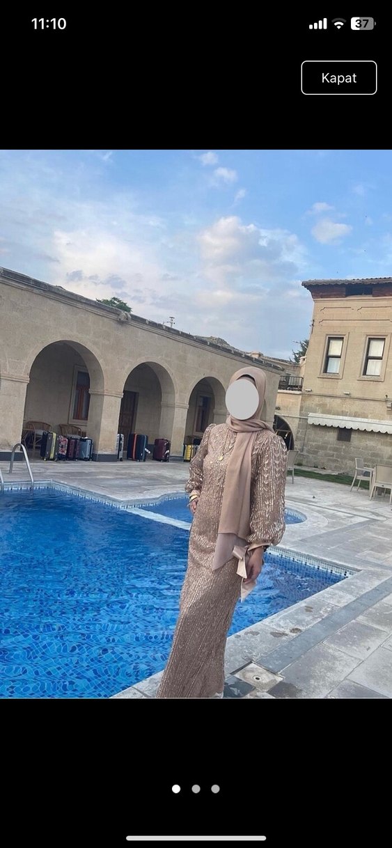 Bej renkte, yüksek yakalı ve uzun kollu, yumuşak sentetik kumaştan yapılmış uzun elbise. Drapeli tasarımı ve regular kesimiyle düğün stiline uygundur. Hasarsız bir defa kullanılmıştır