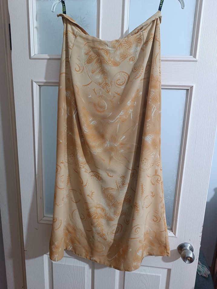 Bej renkte, uzun boyda, drapeli ve bağlama desenli bu etek, ipeksi dokusuyla bohem tarzı yansıtır. Rahat kesimiyle ofis kullanımı için uygundur.