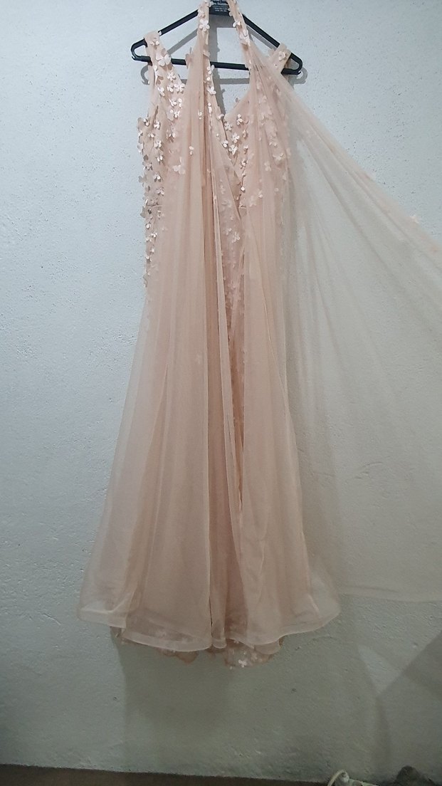 Bej renkli, drapeli uzun abiye elbise; V yaka ve kolsuz tasarıma sahip. Bol kesimi ve bohem tarzıyla düğünler için uygundur. Yumuşak ve akışkan kumaştan yapılmıştır.