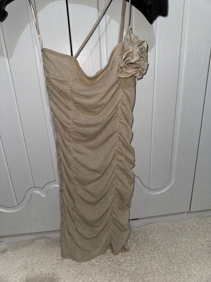 Bej renkte, uzun ve vücuda oturan bu elbise ince askılar ve drapeli detaylarla parti için uygun şık bir modeldir.