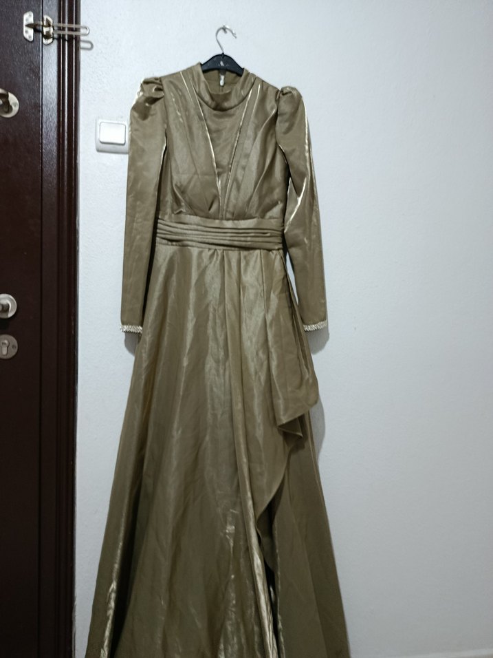Haki renkli, parlak görünümlü uzun abiye elbise. Drapeli detaylar ve yüksek yakası bulunur. Uzun kollu ve rahat kesim, düğünler için uygun. ✨