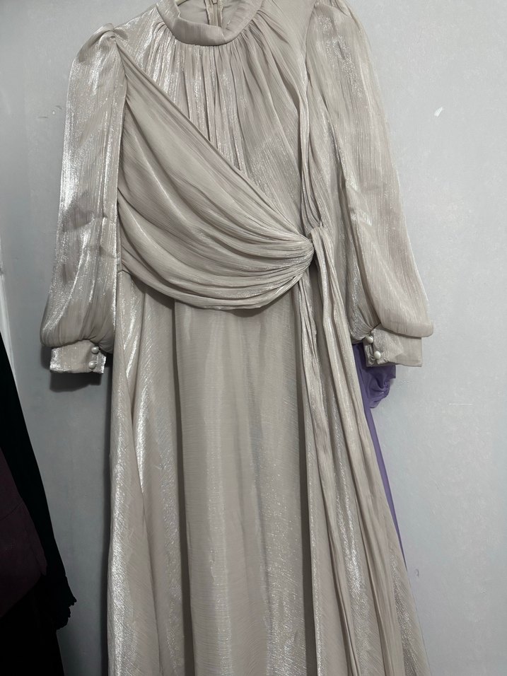 Bej renkte, yüksek yakalı ve bol kesim uzun abiye elbise. Drapeli detayları ve uzun balon kol tasarımıyla modern bir görünüm sunar.