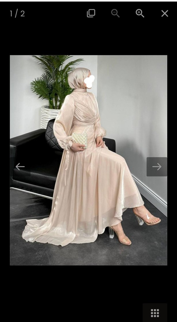 Bej renkli, uzun ve bol kesim abiye elbise. Drapeli detaylara ve askısız, ince askılı yaka tasarımına sahiptir. Düğünler için şık ve çağdaş bir modeldir. yanında şalı da vardır