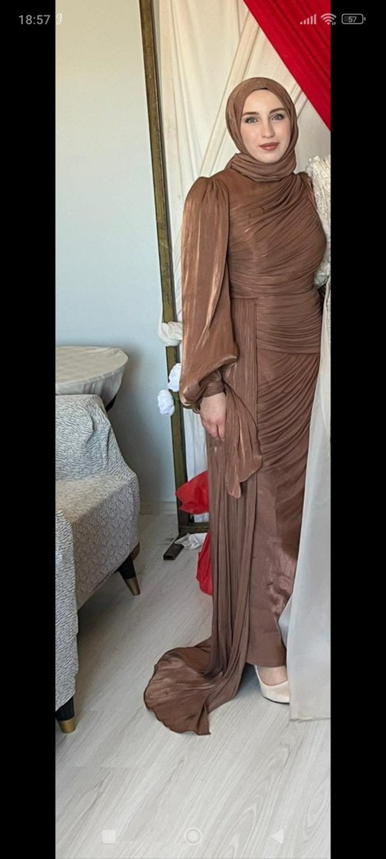 Bej renkli, uzun ve drapeli kadın abiye elbise. Yüksek yakalı ve uzun kollu tasarımıyla, düğünler için avant-garde ve şık bir görünüm sunar.