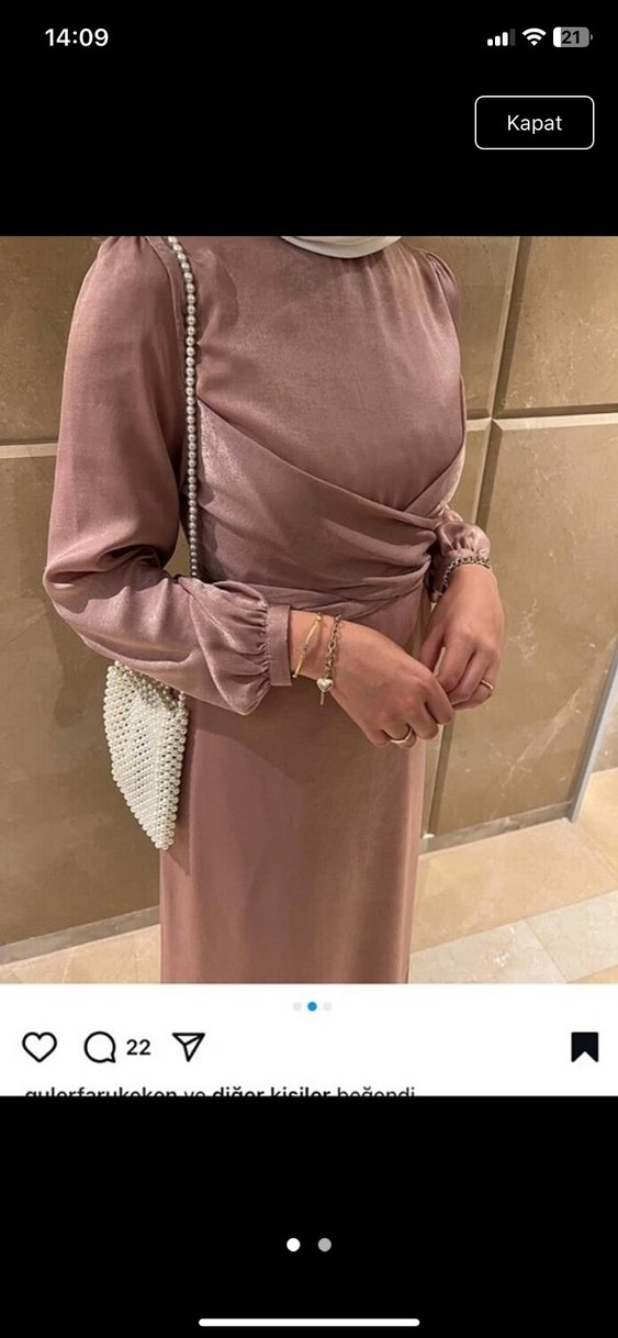 2 beden. Hiç giyilmedi İp çekmeleri var belli olmuyor Ön kuşakta küçük bir ayrılma vardı dikildi uzun ve drapeli, yüksek yakalı, ince askılı, sade ve şık kadın abiye elbise. Minimalist ve modest tarzlara uygundur.