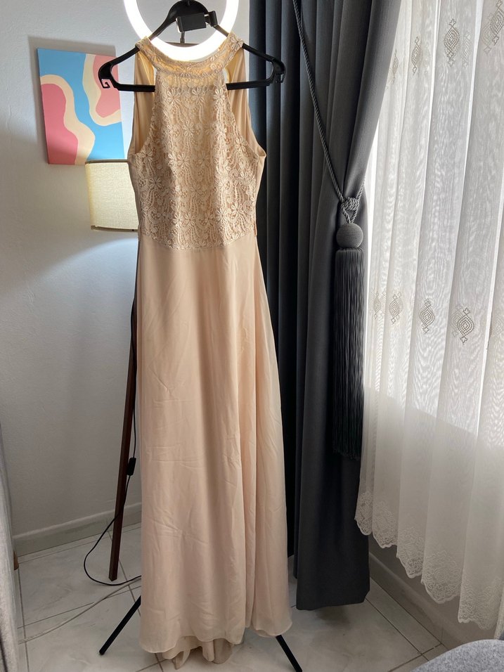 Bej Uzun Drapeli Kadın Abiye Elbise