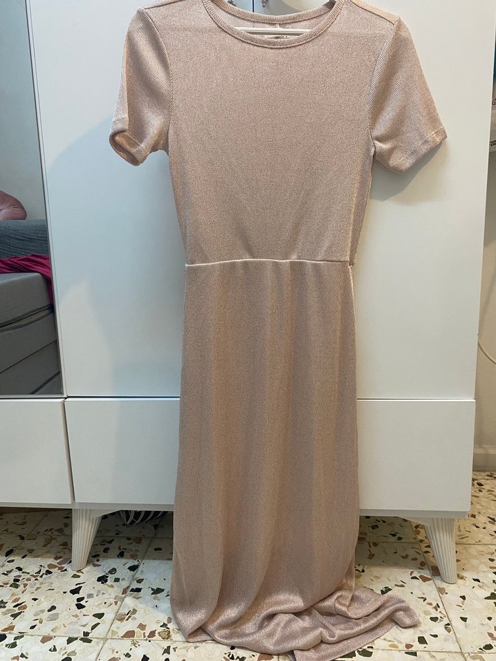 Bej renkte, kısa kollu, yuvarlak yakalı ve drapeli detaylı uzun kadın elbisesi. Yumuşak sentetik kumaştan, düğün gibi özel anlar için uygun, Paris havası ve ışıltısını yansıtır. Hafif simli kumaş uzun elbise, bir sorunu yoktur sayılı kullanıldı. Reserved marka M beden