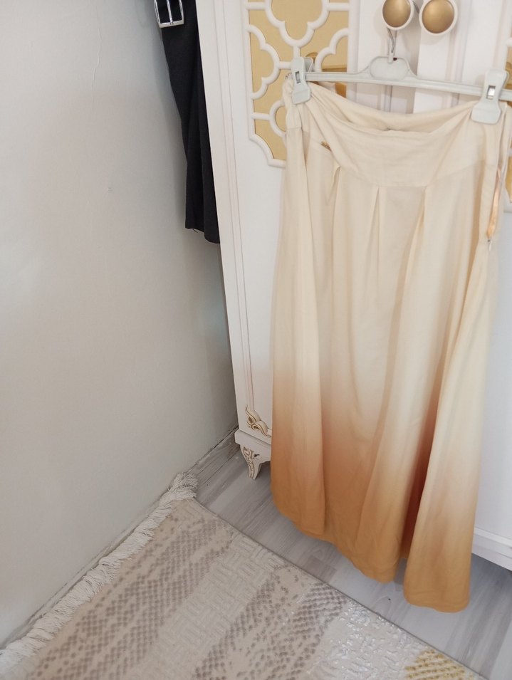 Bej renkli, uzun ve drapeli kesime sahip kadın eteği, ince ve ipeksi dokusuyla öne çıkar. Bohem ve minimalist tarzıyla düğün gibi özel anlara uygundur.