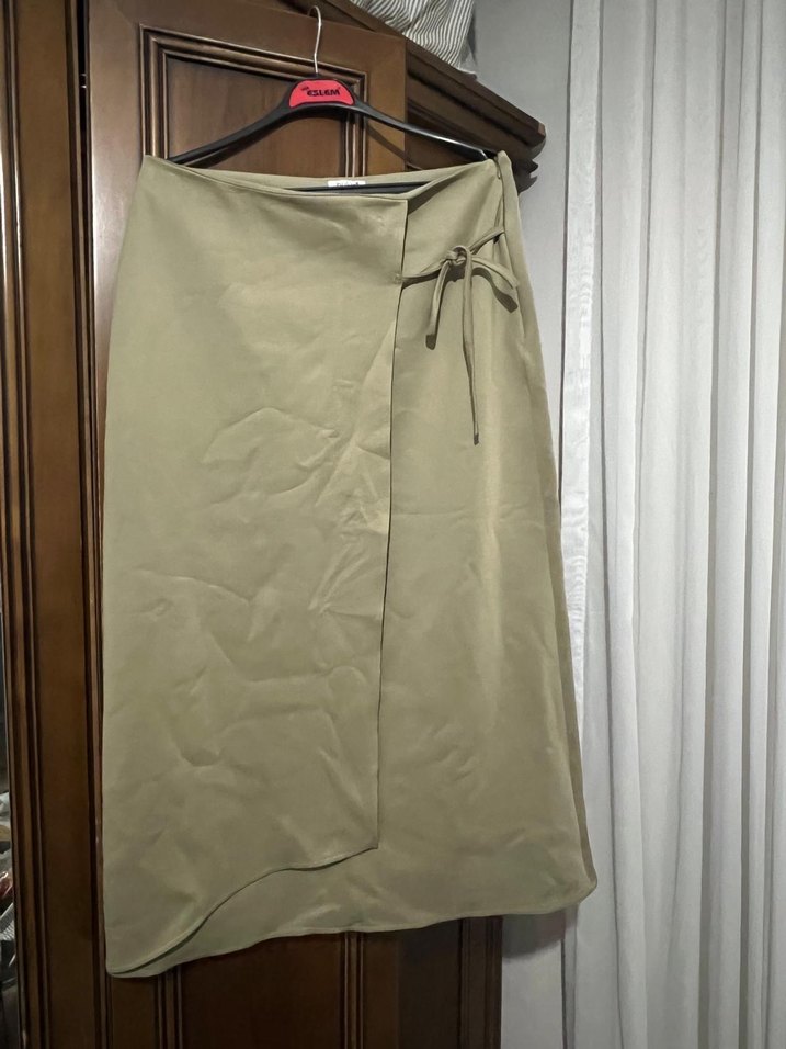 Bej renkte, drapeli ve salaş kesim uzun etek. Yumuşak sentetik kumaştan, desen içermeyen sade ve bohem tarzda günlük kullanım için uygun.