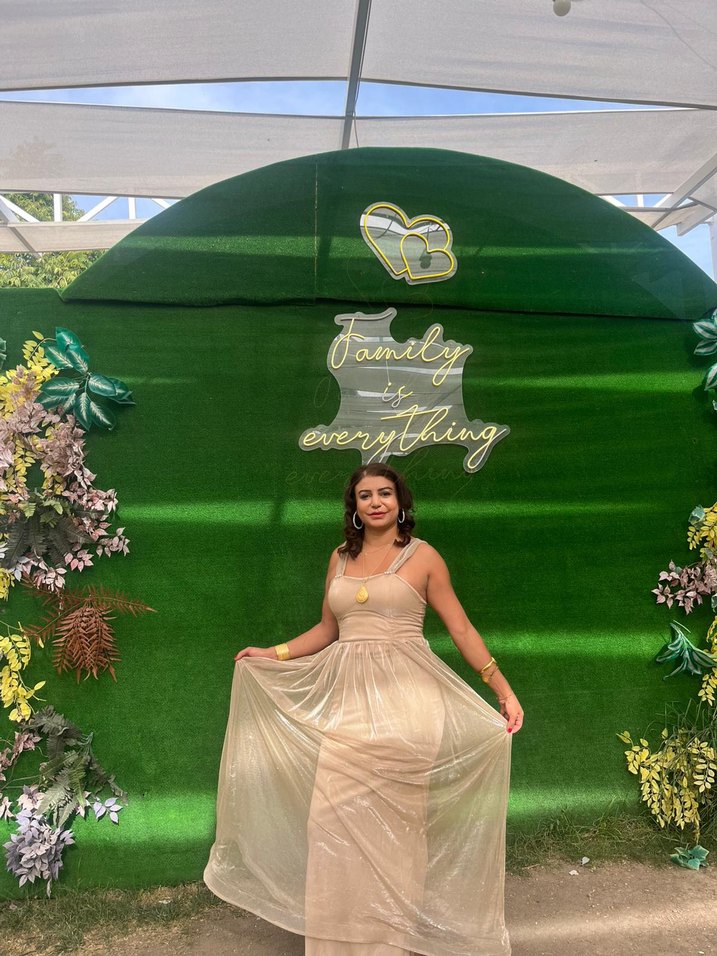 Drapeli, askılı kolları olan bej uzun elbise kendinden simli esnek kumas. 1 kez 2 saat giyilmistir