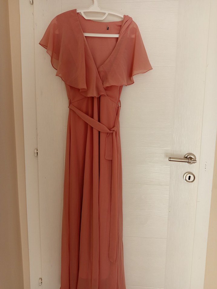 Bej uzun elbise, V yaka ve askılı kollara sahip drapeli tasarımla. Bol kesim ve kuşaklı, düğünler için uygun.