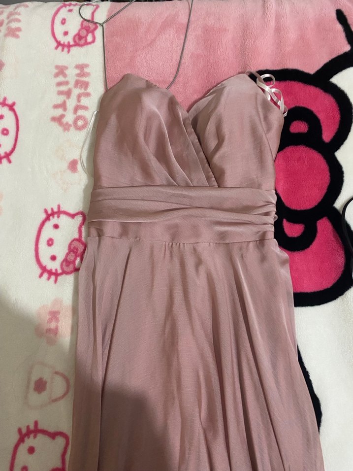 Bej renkli, drapeli ve uzun kesim kadın abiye elbise. V yaka, ince askılı ve vücuda oturan modern klasik tarzda, parlak kumaşlıdır. Düğün için uygundur.