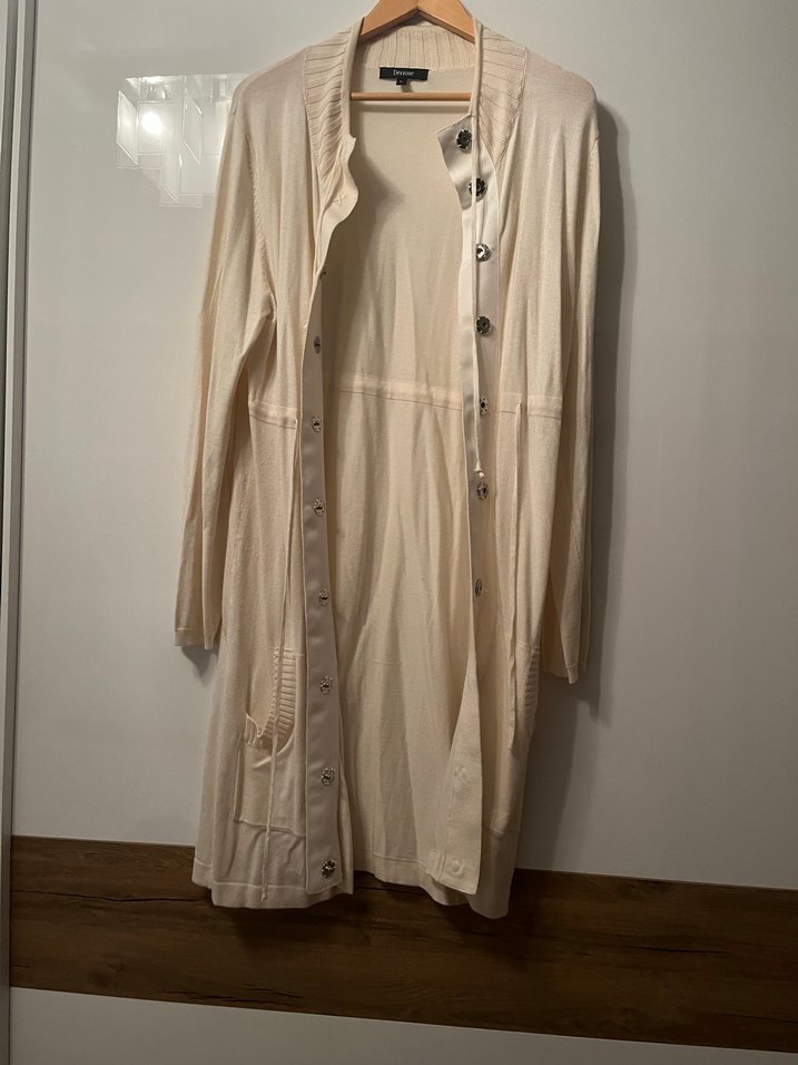 Bej renk, uzun boy, Rahat kesim, yumuşak triko kumaş ve bohem tarzda yakaya sahip.