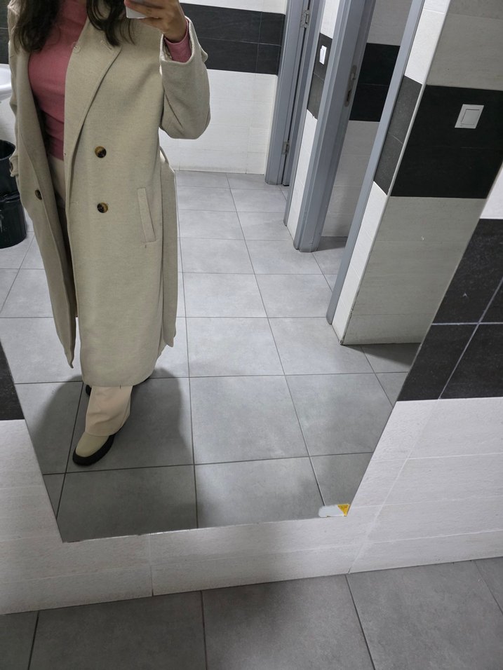 Bej renkli, uzun, çift düğmeli ve yan cepli kaban. Yumuşak dokusu ile sade ve şık bir görünüm sunar.