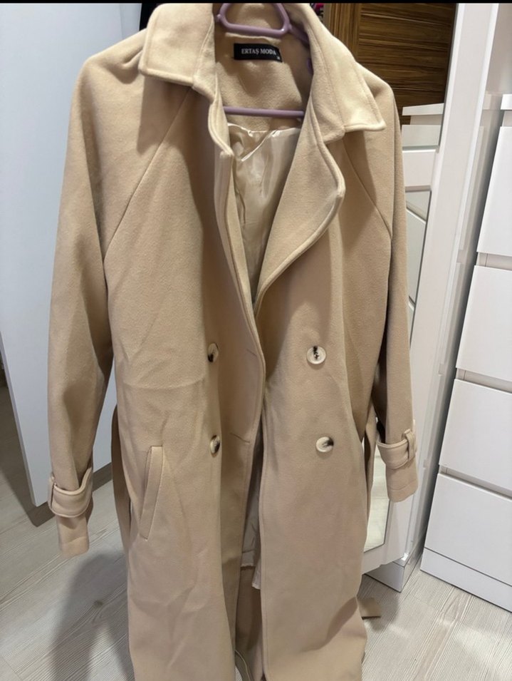 Bej renkte, düğmeli uzun kadın kaban. Notched lapel yakalı, sentetik kumaştan, regular fit ve uzun kolludur. Günlük kullanıma uygun, pastel ve desensiz tasarım.