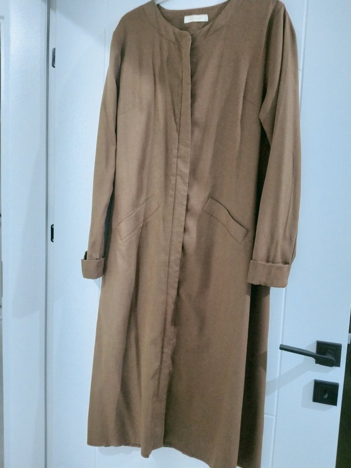 kahverengi uzun keten fermuarlı kap.Minimalist tarzıyla günlük kullanıma uygundur. 42 beden yazıyor ama bence 40 bedene tam olur
