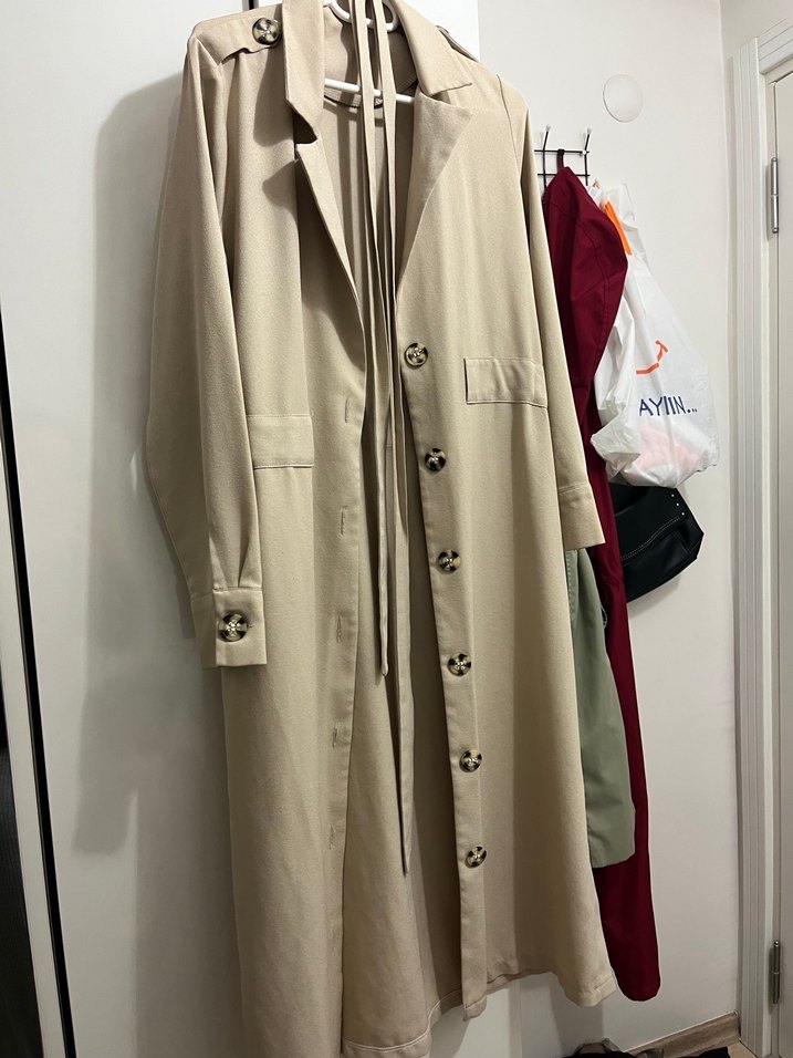 Bej renkli, uzun ve düğmeli kadın trençkot. Geniş kesim, notched yaka ve uzun kolludur. Düz, sentetik kumaştan yapılmıştır