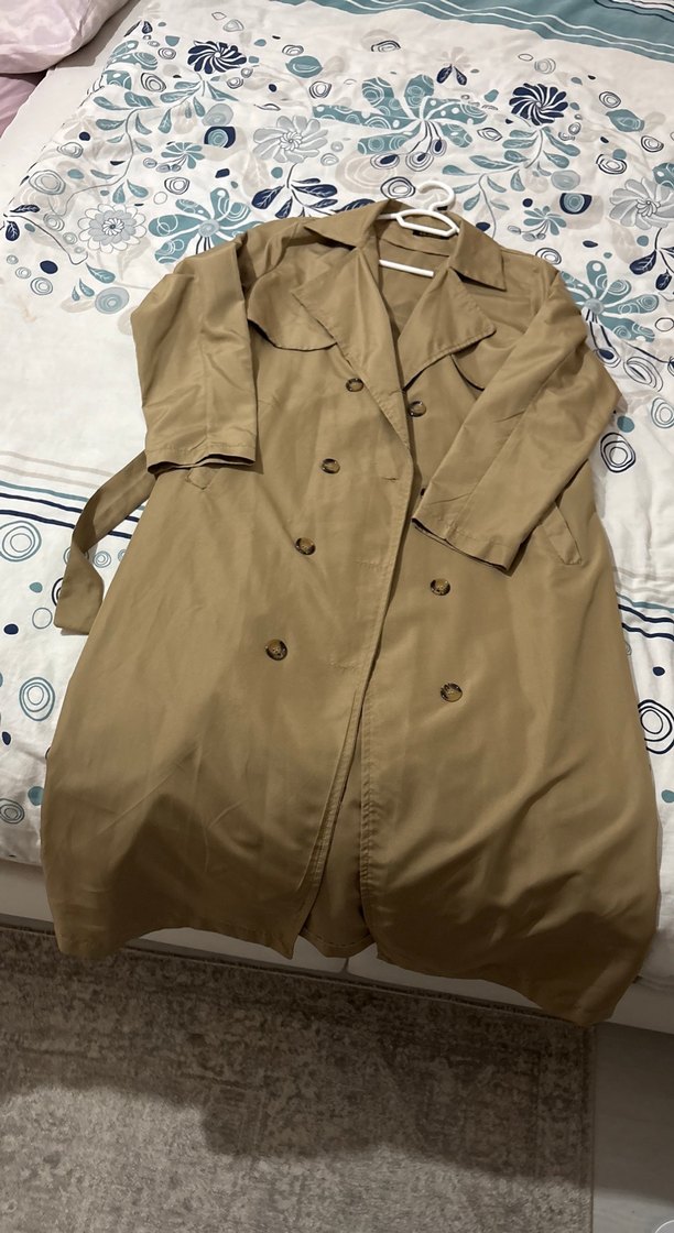 Bej renkli, düğmeli, uzun kol ve notalı yaka detaylı, keten kumaştan yapılmış bol kesim kadın trençkot. Hiç kullanmafım
