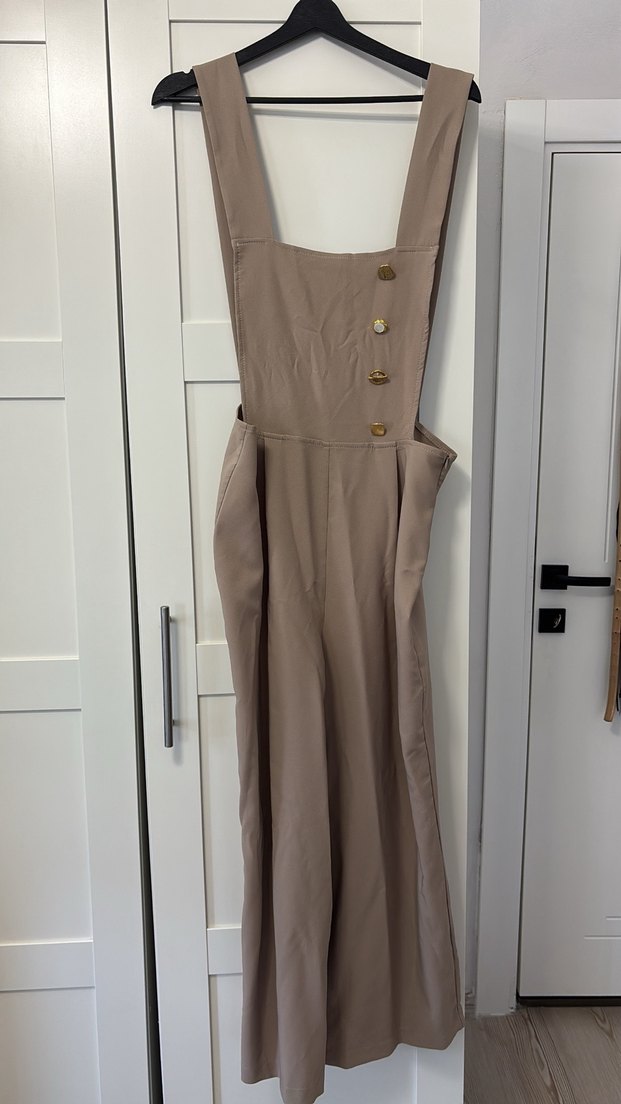 Bej renkli yumuşak kumaş .Düğmeli ve kare yaka beden sorunu ile satıyorum hiç giyilmedi askıları ve boyu kendinize göre ayarlayabilirsiniz .