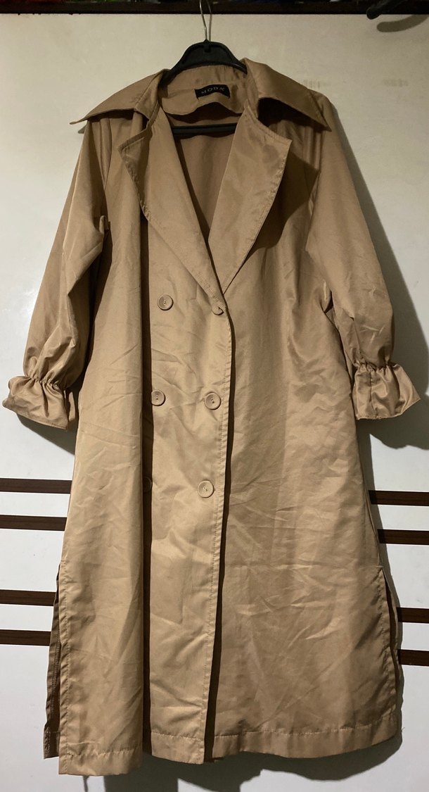 Bej renkli, parlak keten kumaştan uzun trençkot. Düğmeli ve askılı kollu, kesik yaka ve bol kesimlidir. Trend sokak tarzına uygundur. İki göğüs arası 55 santim boy uzunluğu 107 santim
