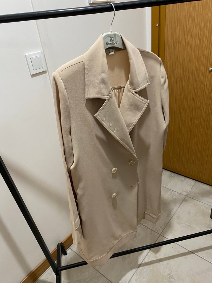Bej renkli, uzun kesim, düğmeli ve kesik yakalı kadın blazer. İpeksi kumaştan, ofis ve sokak stili için uygun, klasik zarafet sunar. ✨