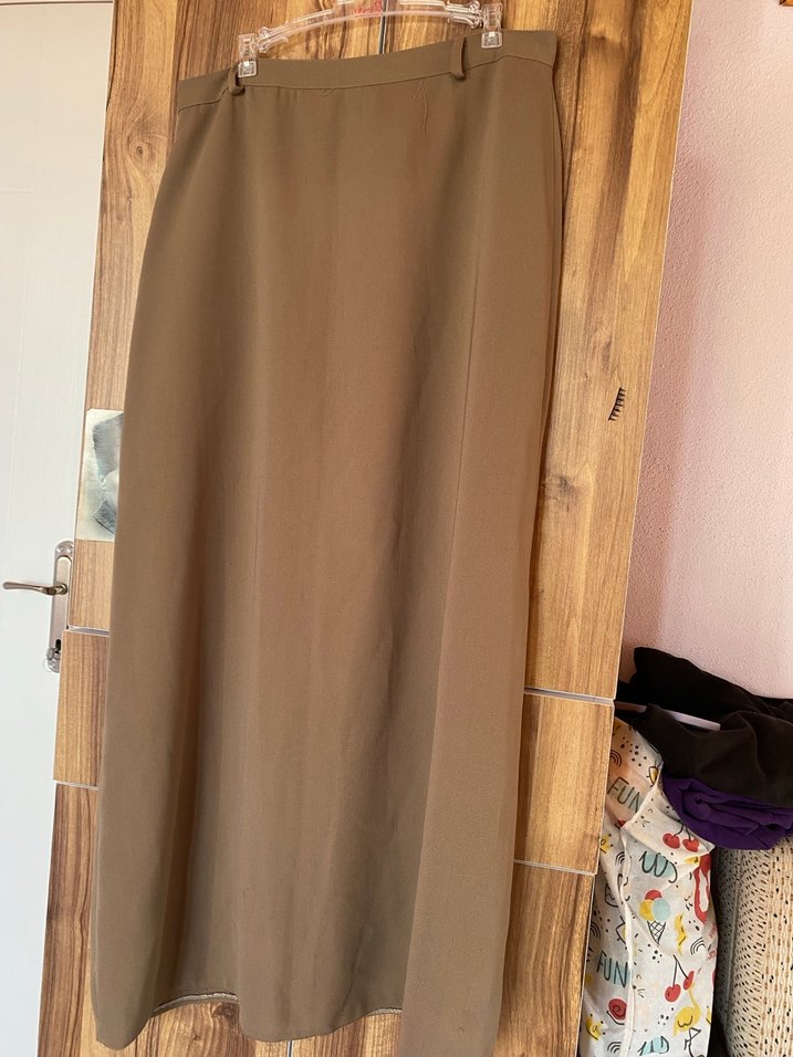 Bej renkte, uzun ve düz kesim kadın eteği. İnce, satenimsi dokusu ve drapeli tasarımıyla ofis için uygun minimal ve sade bir model.