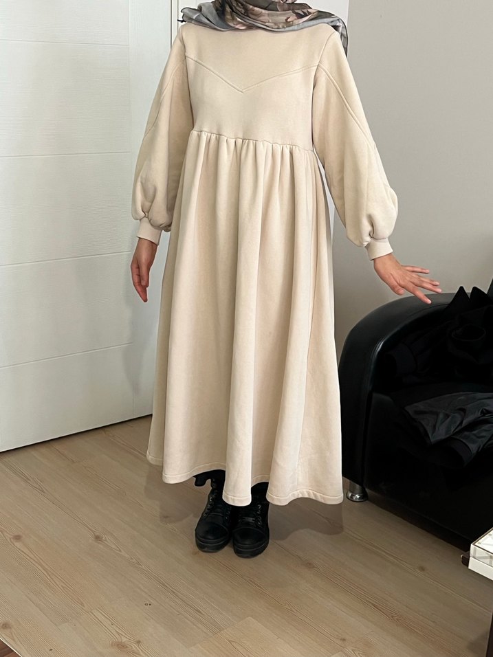 Bej renkte, uzun ve rahat kesim, uzun kollu, bisiklet yaka elbise. Yumuşak ve sıcak kumaştan, desensiz ve günlük kullanıma uygun şık tasarım.