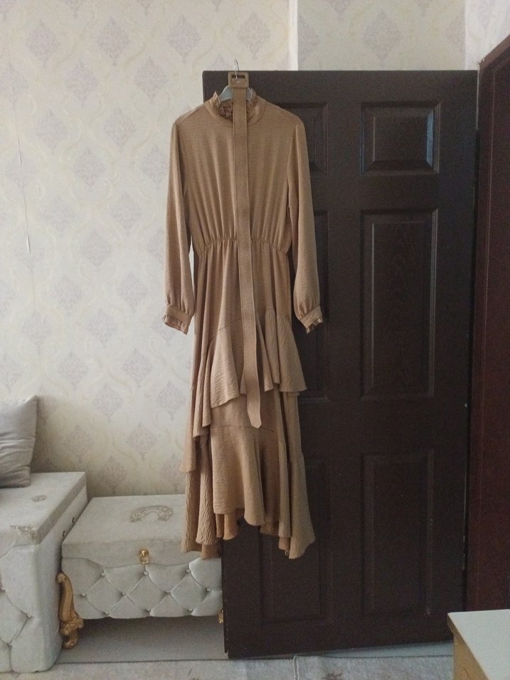 Bej renkte uzun elbise, salaş kesim ve drapeli detaylara sahiptir. İnce askılı ve yüksek yakalı, desen içermeyen şık bir modeldir. hem günlük hem düğünlüktür 36 beden 40 bedene de olur