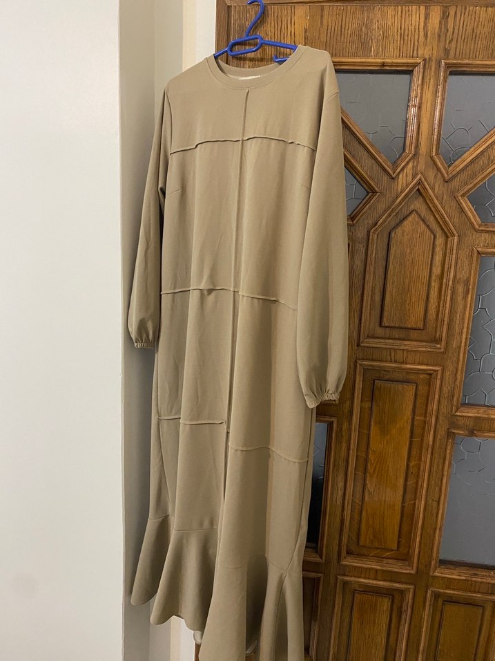 Bej renkli, salaş kesim ve drapeli uzun elbise. Uzun kollu ve yuvarlak yakalı, sade günlük kullanım için uygun. Bir kez gıyıldı çok rahat elbise mevsimlik ve kışa uygun