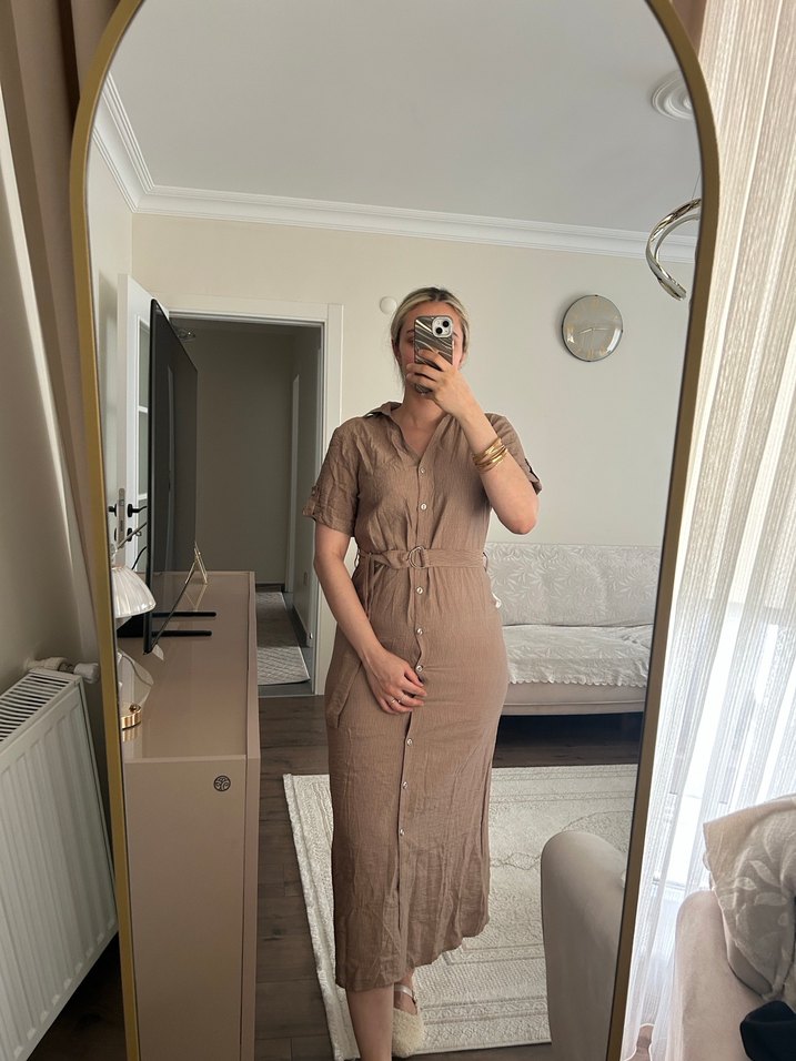 Bej renk, uzun boy, bol kesim elbise. V yaka, kısa kollu, hafif ve nefes alan keten kumaştan. Minimalist, düğmeli ve bel bağlamalı rahat şıklık sunar.
